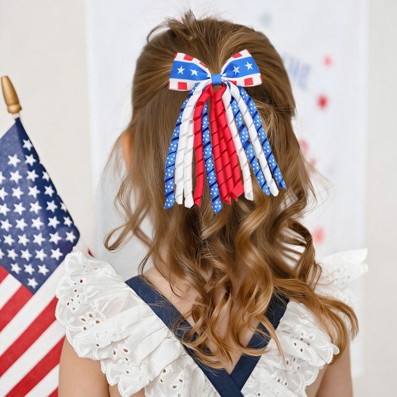Tags: Girls Independence Day Red White Blue Hair Bow Clip Patriotic American Flag Curly Ribbon Hair Bow Accessories, 20260320, 4th of july