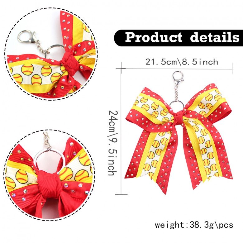 Glitter Cheerleading Hair Bow Keyring with Rhinestone Football Basketball Baseball Cheer Keychain Sporty Bag Boutique Decoration